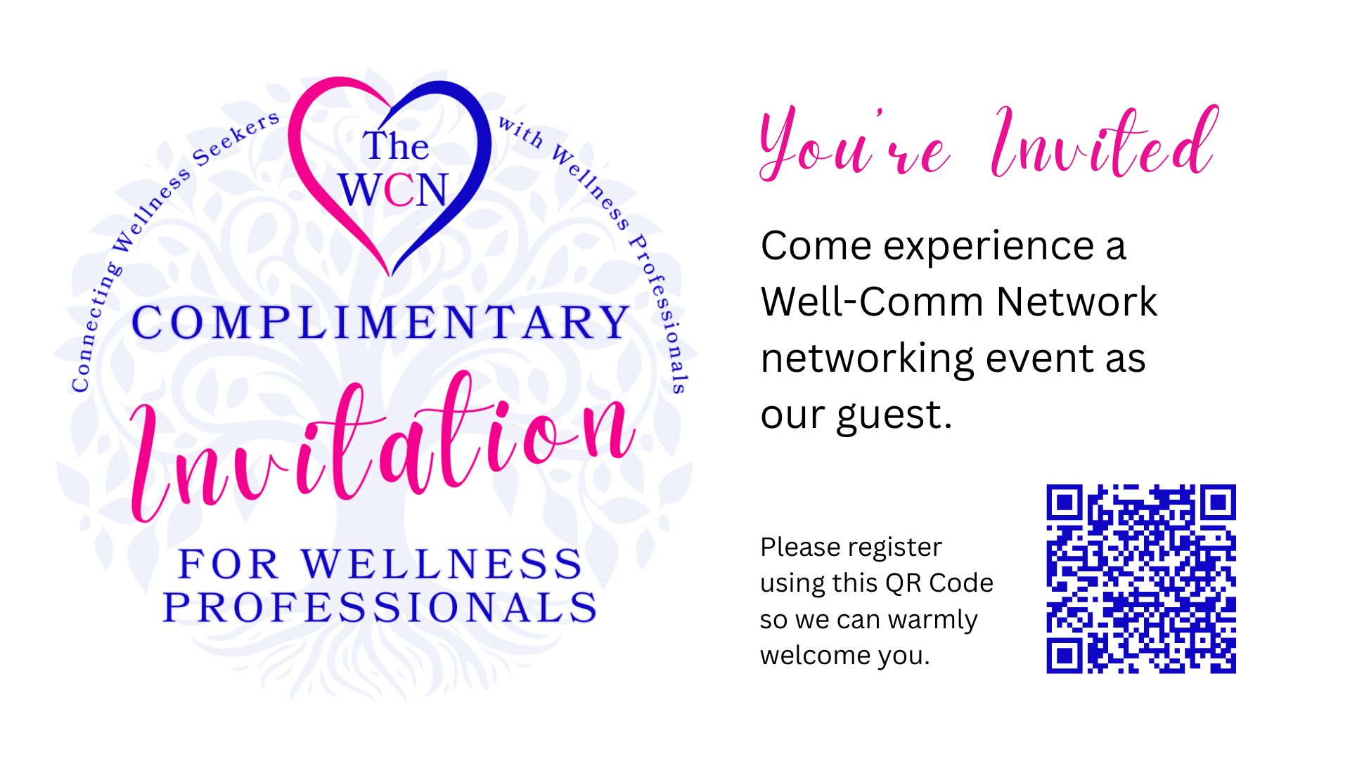 If you’ve never attended a Well-Comm Network event and would like to experience one of our networking events, we’re happy to extend a heartfelt invitation, a complimentary guest ticket.
